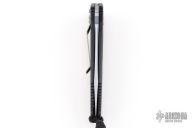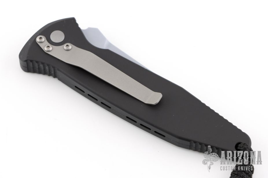 This Mini Socom Auto (2/2000) has a silver coated 154-CM stainless steel tanto blade. Handle is black aluminum with non-slip inserts, lanyard, and bead blasted titanium tip down clip. Signed on the blade, 157/476. Comes with original box, papers, and belt sheath. Excellent condition.