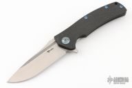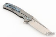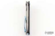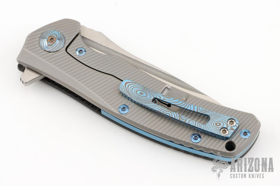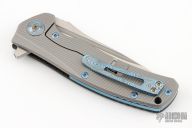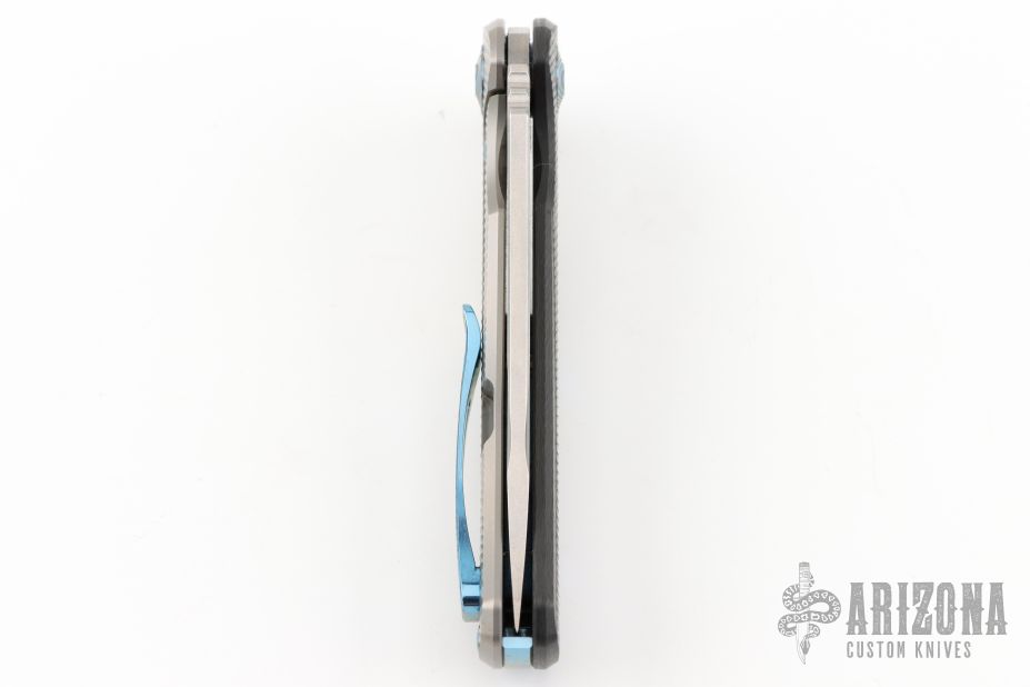 This Horizon D from Reate Knives features a tumble finished blade with fuller, notched thumbrest and flipper. The handle has a bead blasted and milled titanium frame with carbon fiber scale. Pivot and tip up pocket clip have been anodized for a faux mokuti appearance, all other hardware and backspacer have been anodized blue. Nice detent, lockup and blade seating. Excellent condition. Comes with original box and zippered case. Cranes Production Exclusive
