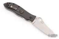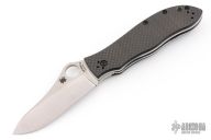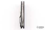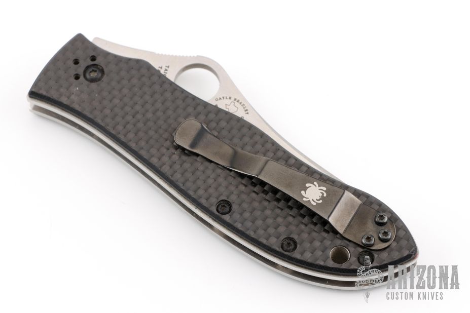 This Bradley liner lock folder by Spyderco features a satin finish blade with thumb hole. Carbon fiber pattern G-10 scales, polished stainless steel liners, and black coated stainless steel pocket clip, tip up carry, 4 way reversible. Strong lock up, nice detent and blade seating is center. Excellent condition. Comes with original box and papers.