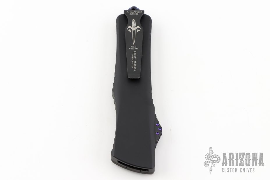 This Custom Combat Troodon Interceptor by Marfione Custom Knives features a two-tone stonewashed blade with sawteeth on the blade spine and a sharpened top edge. The handle is hand sculpted carbon fiber and black aluminum with blue ringed titanium hardware, and a black stainless steel pocket clip. The clip is marked "A. Marfione" and dated 02/2017 with dagger logo is on the clip and #009. Comes with original box, zippered case and COA. Excellent condition.