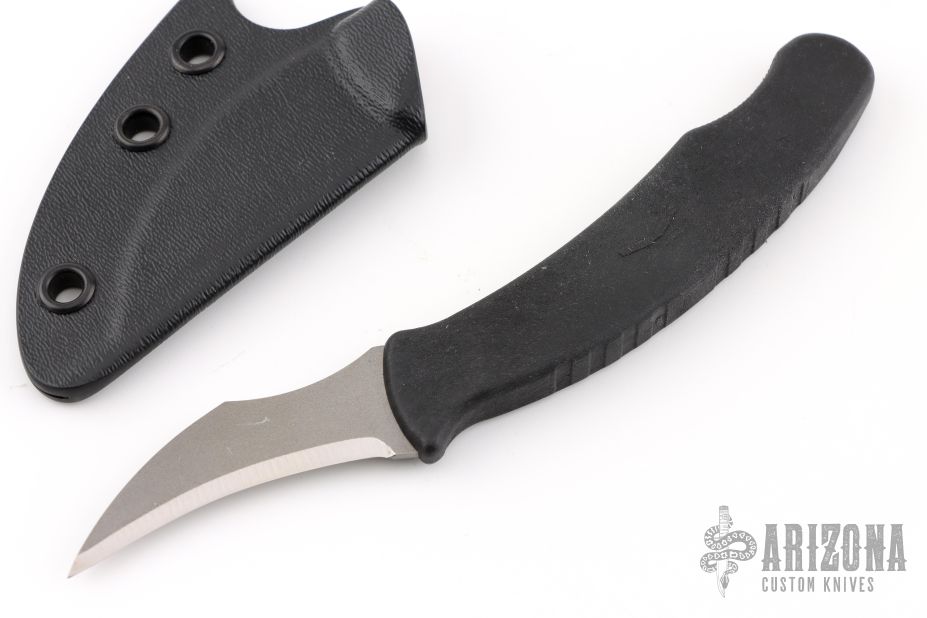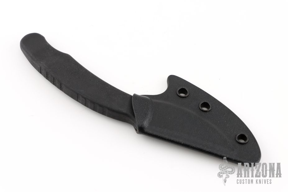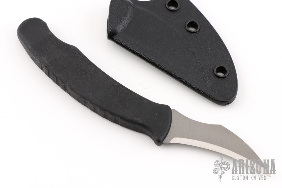 This L-via by Kopis Design features a bead blast and tumble finish hawkbill blade with thumb ramp, .061" blade stock and .784" blade depth, hidden tang construction. The handle is glass filled nylon. Comes with a kydex sheath. Has a couple light scuffs, excellent condition otherwise.