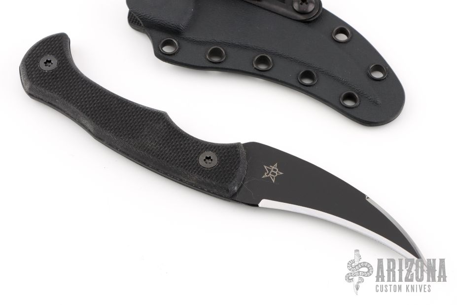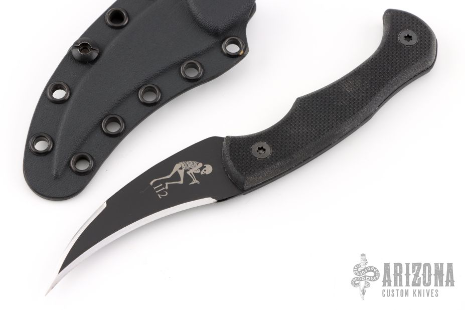 This Pik by JB Knife and Tool features a black double edged blade with .064" blade stock and 1.136" blade depth, full tang construction. The handle has black G-10 scales. Comes with a kydex sheath. Has a couple light scuffs, otherwise Excellent condition.