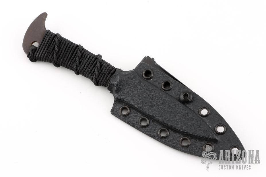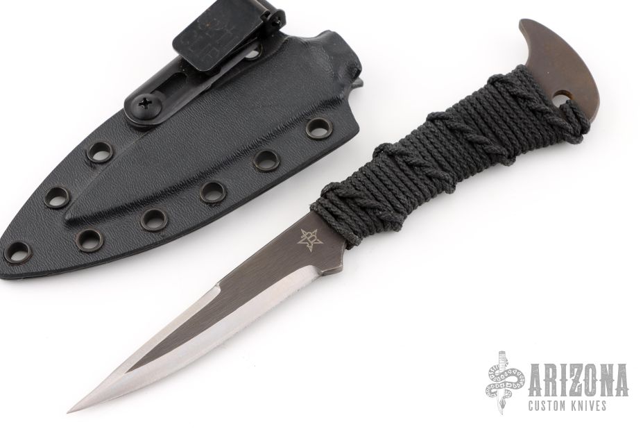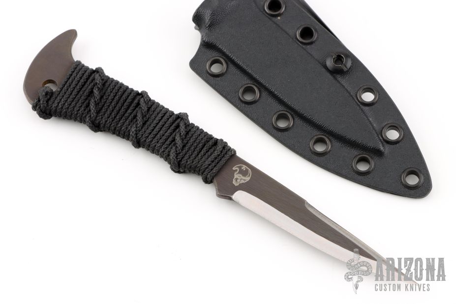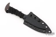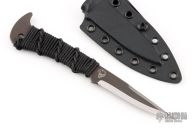 This knife by JB Knife and Tool features a double edged black oxide blade with .130" blade stock and .802" blade depth, full tang construction with epoxied black cord wrap. Comes with a kydex sheath. Has a couple light scuffs, otherwise Excellent condition.