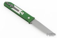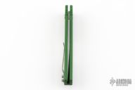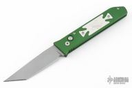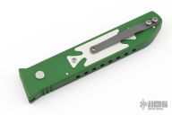 This Jammer by Rob Dalton features a bead blast chisel ground tanto blade and a green aluminum handle with an aluminum inlay. Bead blast titanium clip, tip up carry. Strong and fast coil-spring opening. Numbered 0142 on frame. Has some light scuffs, otherwise excellent condition.