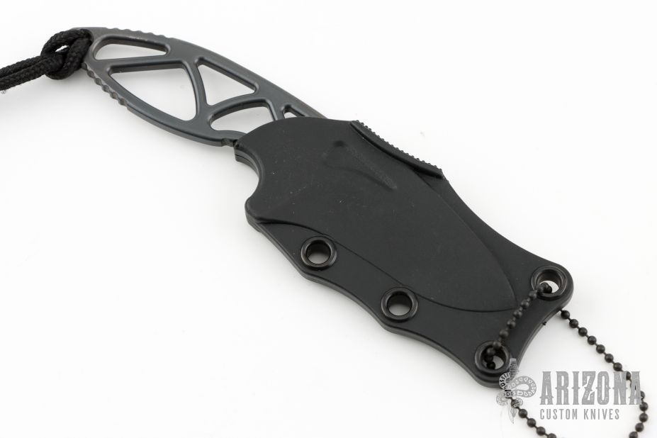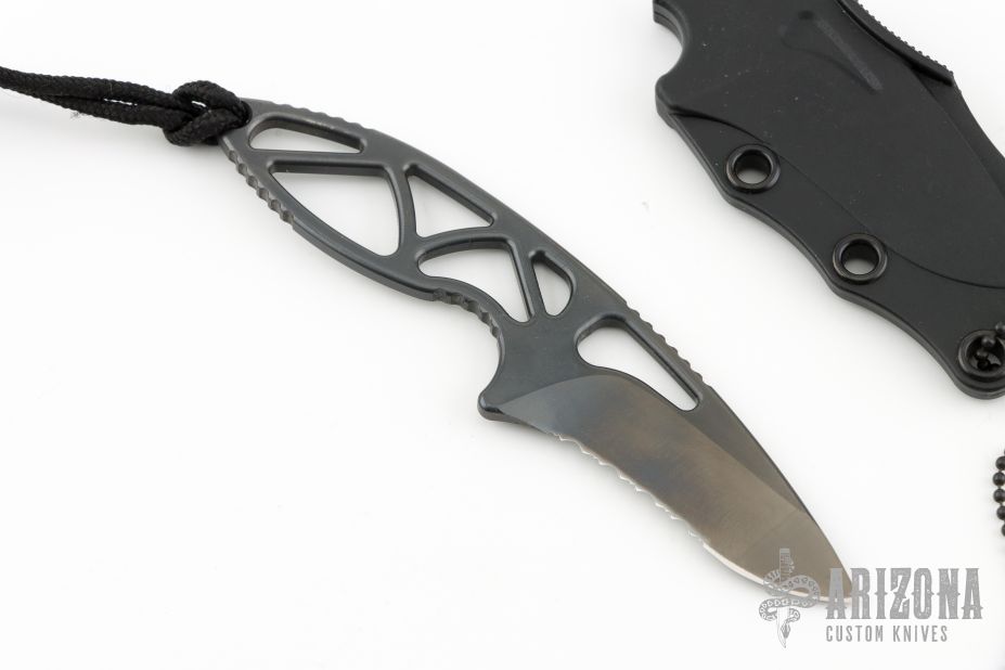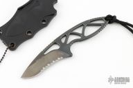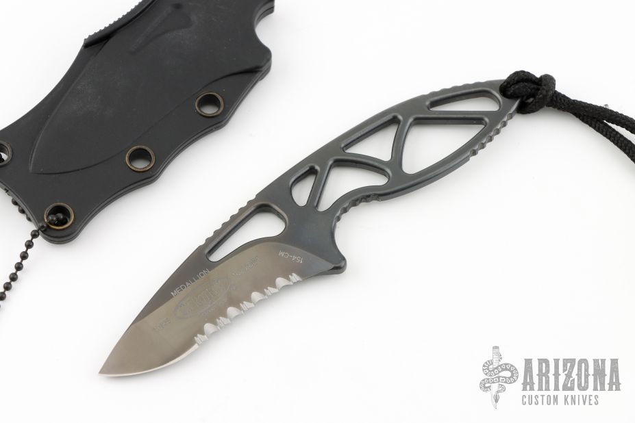 This Medallion neck knife has a black partially serrated blade with notched thumbrest, .157" blade stock and 1.299" blade depth, full skeletonized tang construction. Dated 10/2001 and s/n 1024. Comes with original box, papers, and Kydex sheath/ball chain. Excellent condition.