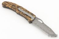 "The new Lobo automatic is a double-action automatic knife that can function as a one handed opening locking-liner knife or be instantly fired in the automatic mode. The Lobo has a 3.5 inch blade to handle any cutting chore and a convenient stainless steel pocket clip. The automatic firing mechanism is hidden under the handle and is activated by sliding the left side handle scale towards the top of the knife. Because there are no apparent buttons on the outside of the handle the fact that the Lobo is an automatic is known only to its owner. This makes the Lobo convenient to carry and use anywhere." This Lobo features a Damascus blade and palmwood handle and is from a limited run of 450 knives. Discontinued. Comes with original box, papers, and pouch. Has a few scratches on the clip, otherwise excellent condition.