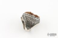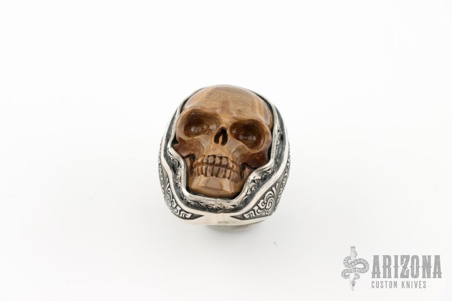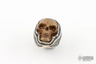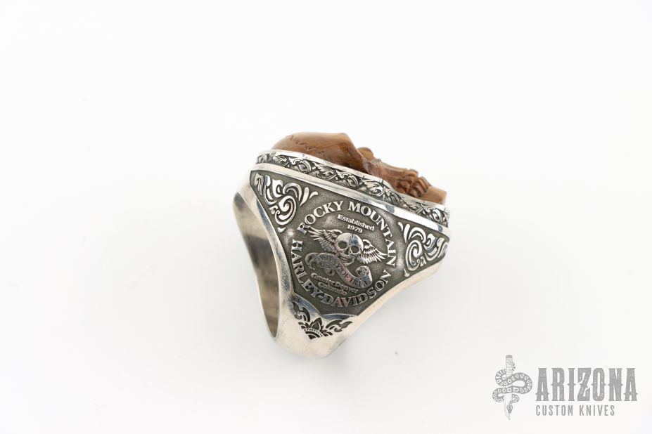 This Ring by Joe Scherhaufer is made of Sterling Silver and has a carved mammoth ivory inlay carved into a skull. Has engraved Harley-Davidson Motor Cycles on both sides. Size 11. New from maker.