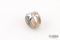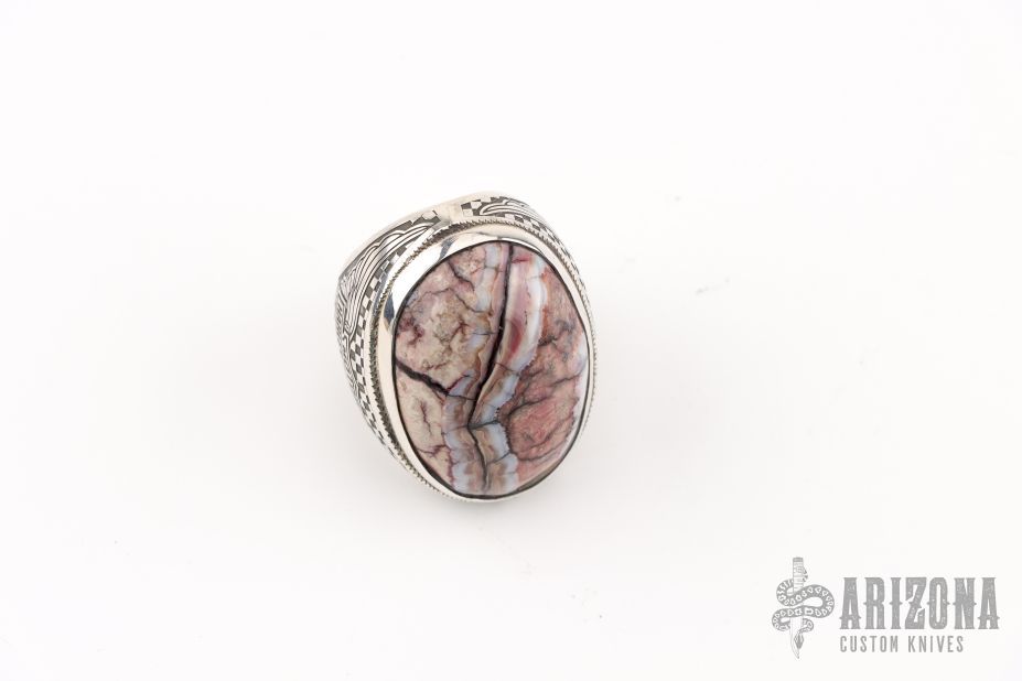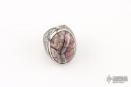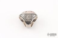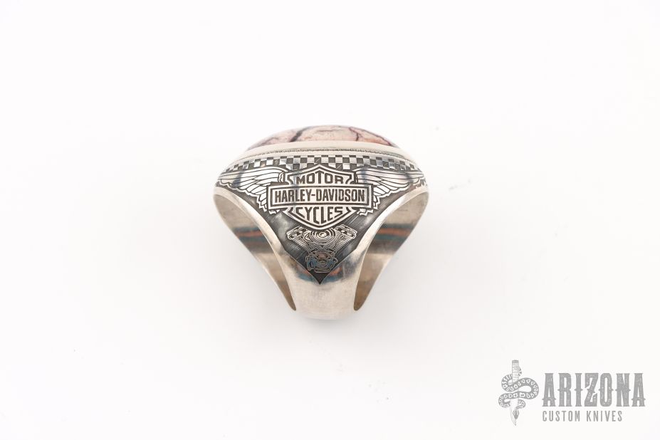 This Ring by Joe Scherhaufer is made of Sterling Silver and has a mammoth tooth inlay. Has engraved Harley-Davidson Motor Cycles on both sides. Size 13. New from maker.