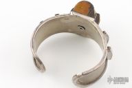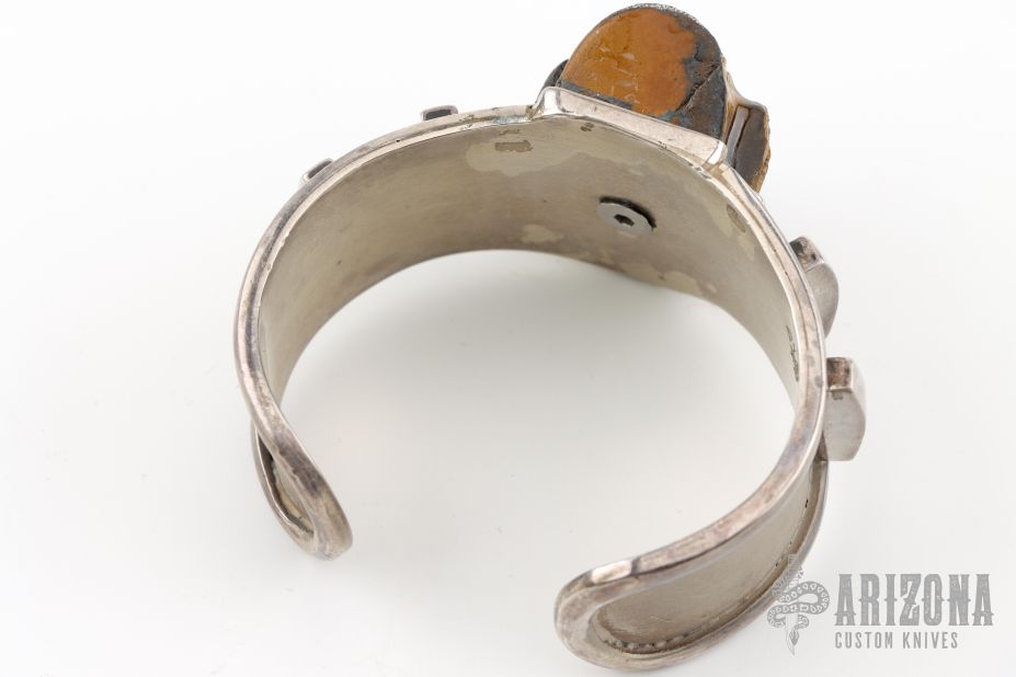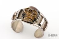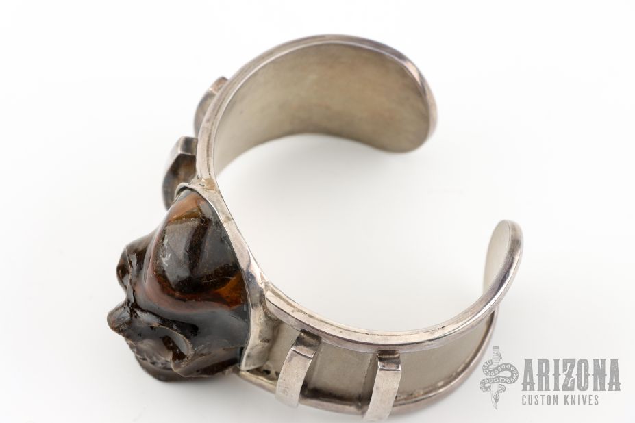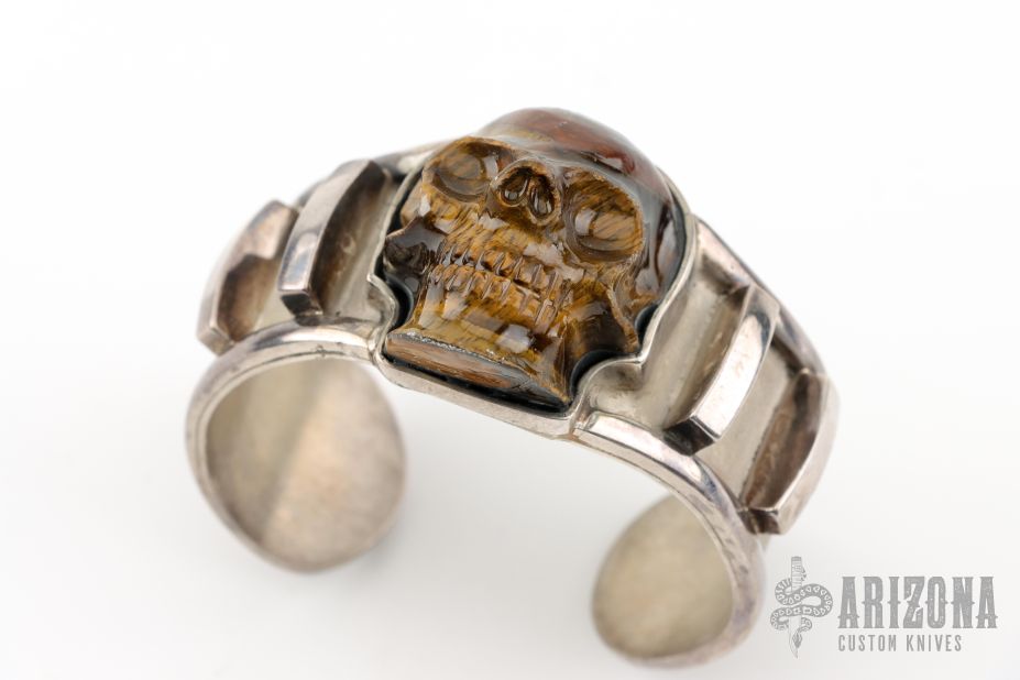 This bracelet by Joe Scherhaufer is made of sterling silver and has a carved skull tiger eye inlay. New from maker. Dated 2022.