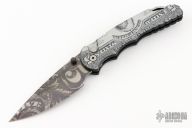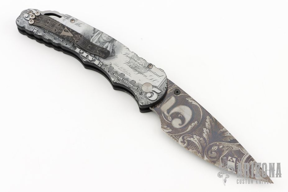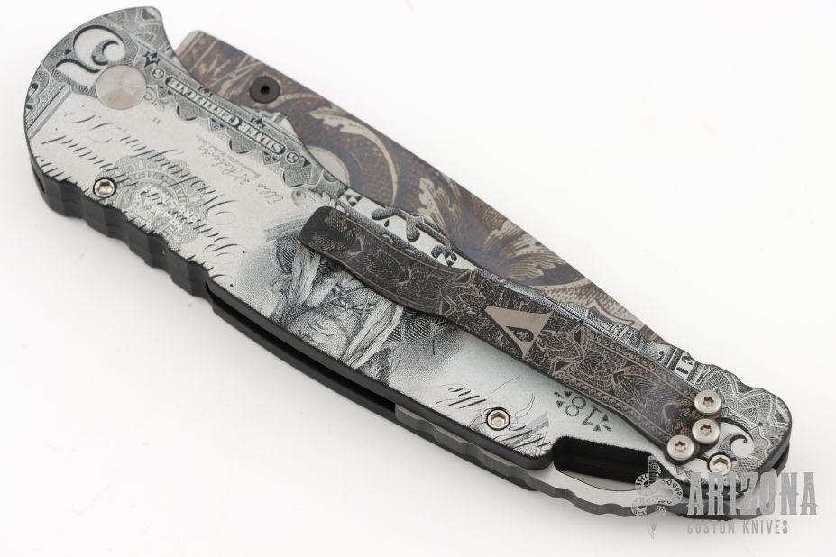 This Tactical Response 4 by Pro-Tech has a laser engraved blade with a plain edge, and single thumbstud. It has a laser engraved black aluminum handle with black stainless steel clip. Steel glass breaker. Comes with original box, papers and nylon sheath.  S/N 08 of 30.  Excellent Condition. Imagery from from the front and back of the series 1899 US $5 Bill.