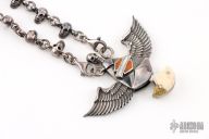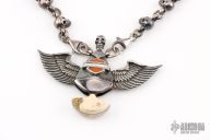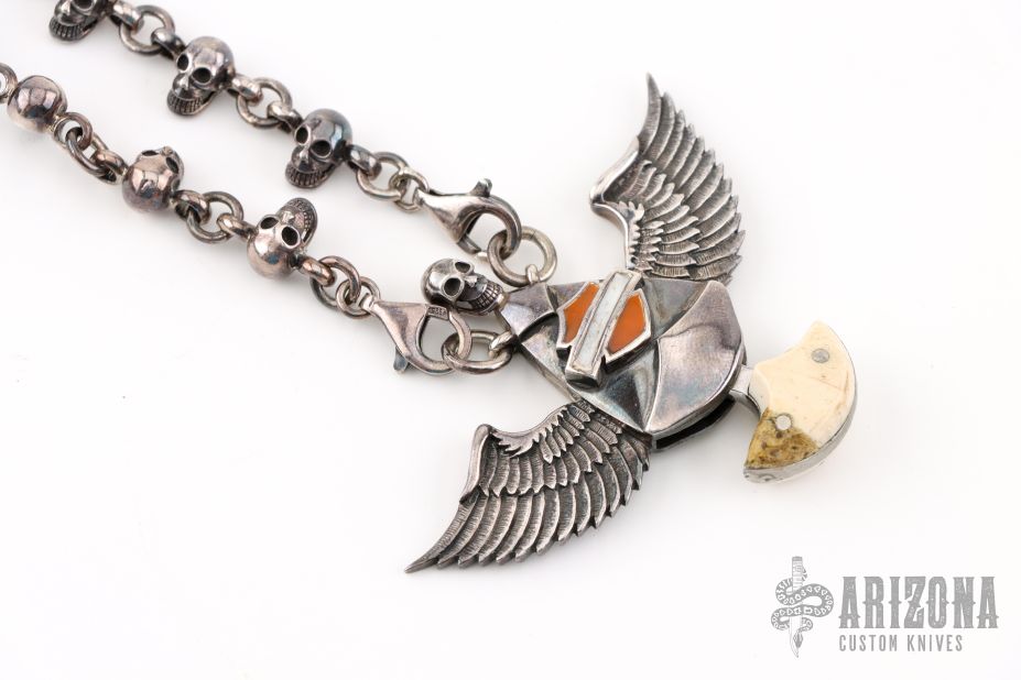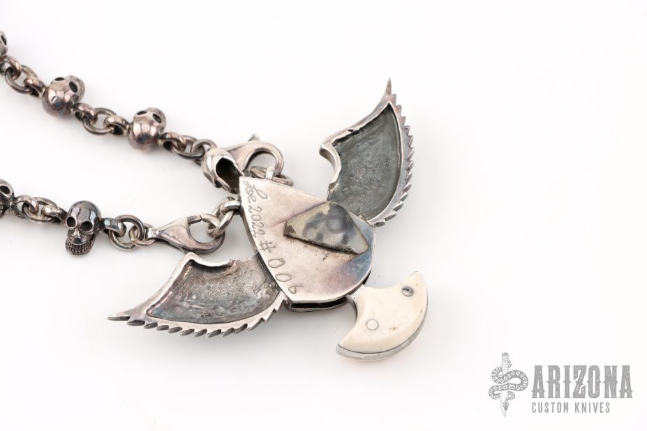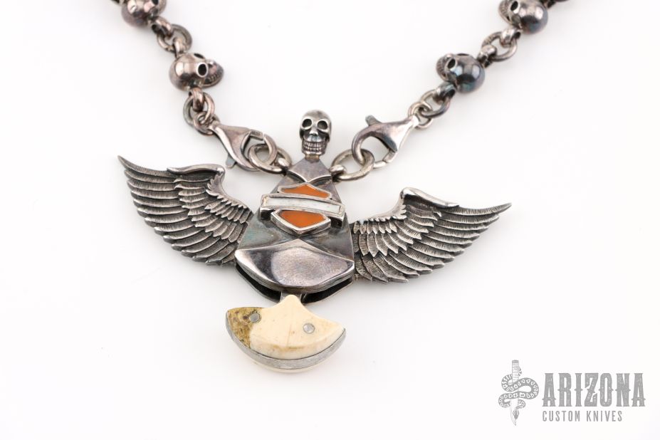 This neck knife by Joe Scherhaufer is hung on a 18" skull necklace with a sterling silver pendant with small push dagger. The blade is mirror polished and double edged, .114" blade stock and .800" blade depth, full tang construction. The handle has mammoth ivory scales. New from maker.
