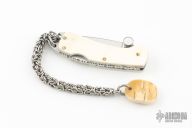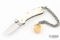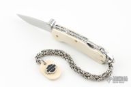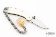 This lockback by Joe's Custom Shop features a mirror polished blade with thumbstud. The handle has mammoth ivory scales, fileworked stainless steel liners and backspacer. Has a small crack in one of the scales. New from maker.