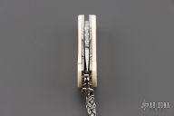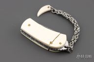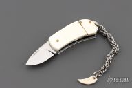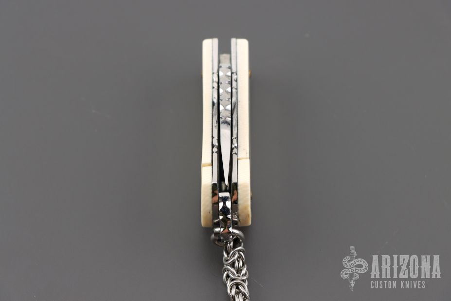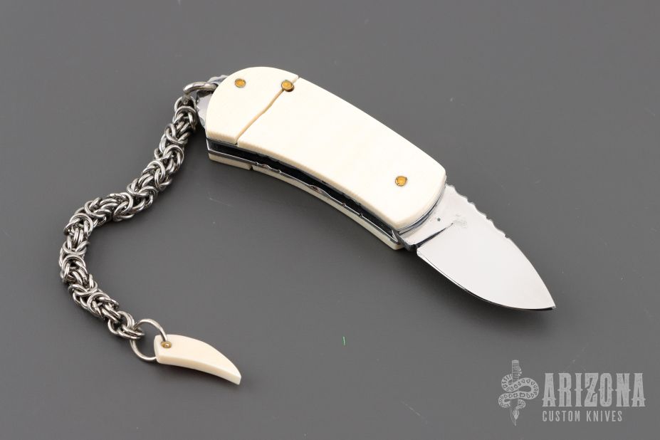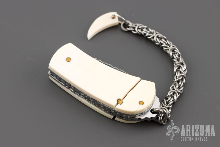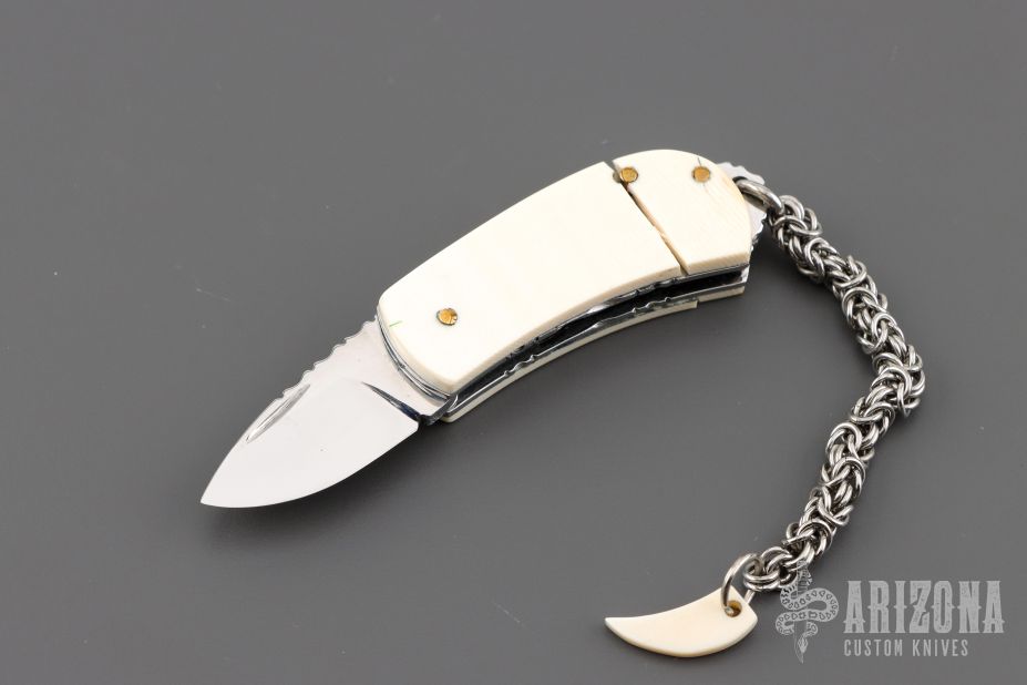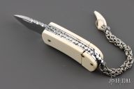 This slipjoint by Joe's Custom Shop features a mirror polished blade with fileworked spine and a nail nick. The handle has mammoth ivory scales, fileworked stainless steel liners and backspacer. Has a few cracks in the scales. New from maker.