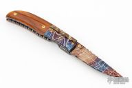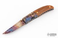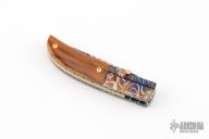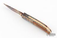 This knife by Jim Downs features an Eggerling Damascus drop point blade with a single gold thumbstud. The handle has Mosaic Damascus bolsters, mammoth ivory scales and gold plated screws, anodized, fileworked titanium liners with jeweled interiors, and micarta backstrap. Smooth action with a nice detent, blade seating and lockup. Includes a padded zippered case. Excellent Condition.