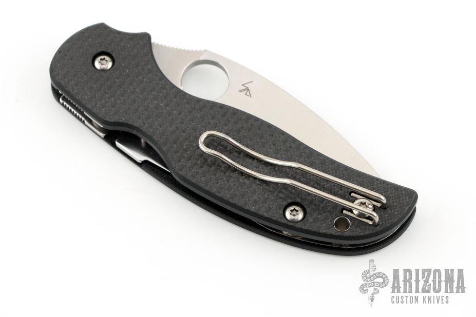 This Sage 5 by Spyderco Knives features a satin finished blade with thumb hole. Carbon fiber pattern G-10 scales, stainless steel liners. Comes with original box and papers. Excellent condition.