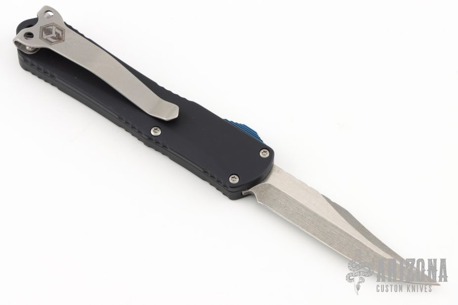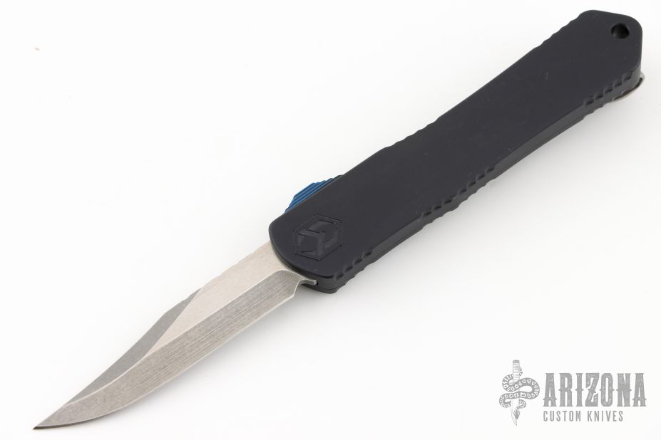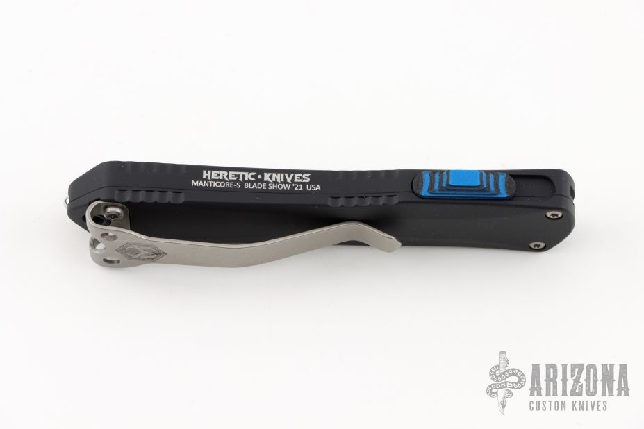 This Manticore-S by Heretic Knives features a stonewashed bowie style blade. The handle has a black aluminum frame with a stainless steel tip down clip, blue G-10 thumb slide. Comes with original box and papers. Excellent condition.