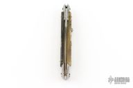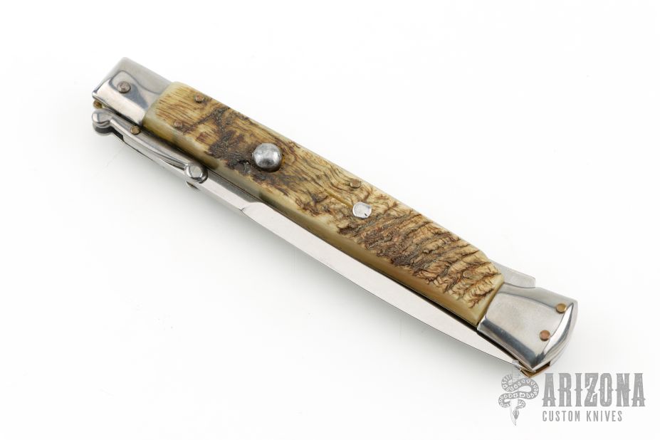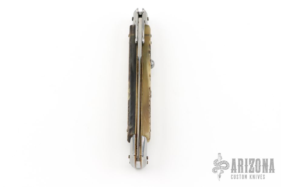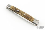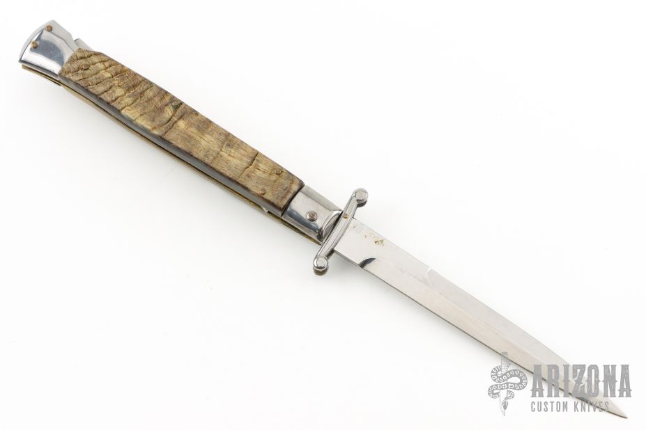 This 11" Swing Guard Auto by Frank Beltrame features a bayonet ground blade with false top edge. The handle has stainless steel bolsters, front and rear, sheep horn scales, brass liners, stainless spring. Excellent condition.