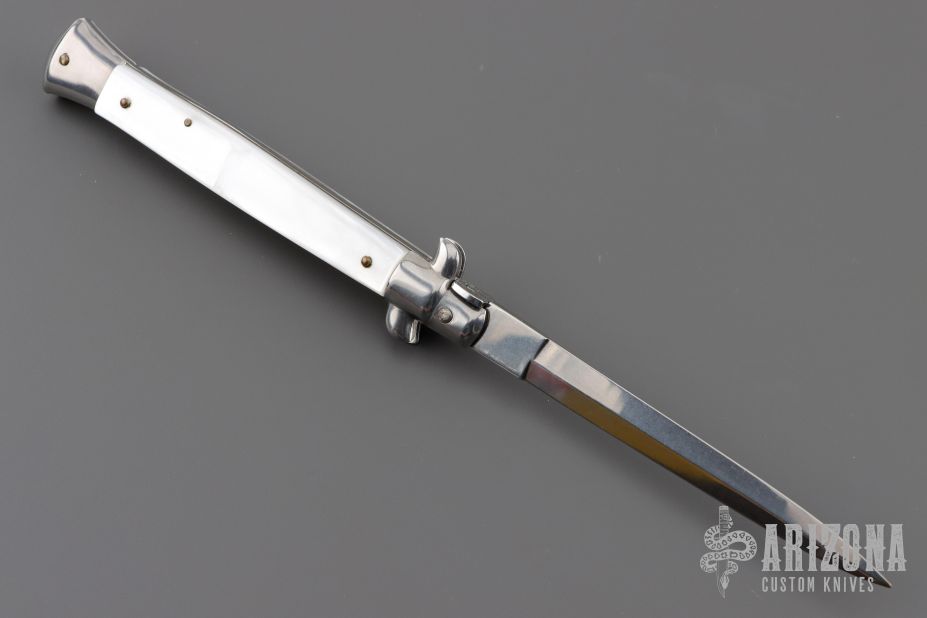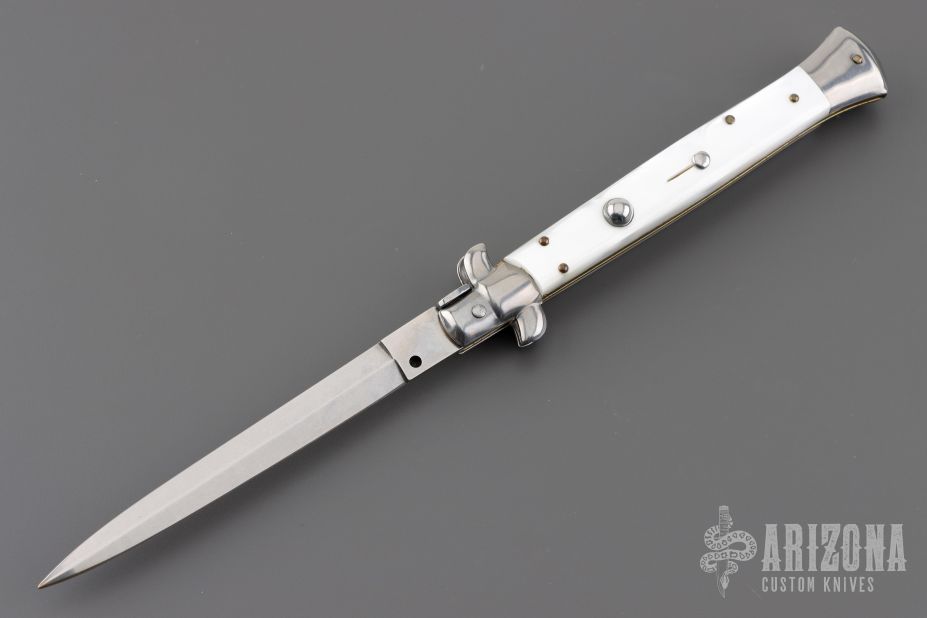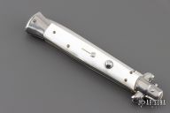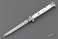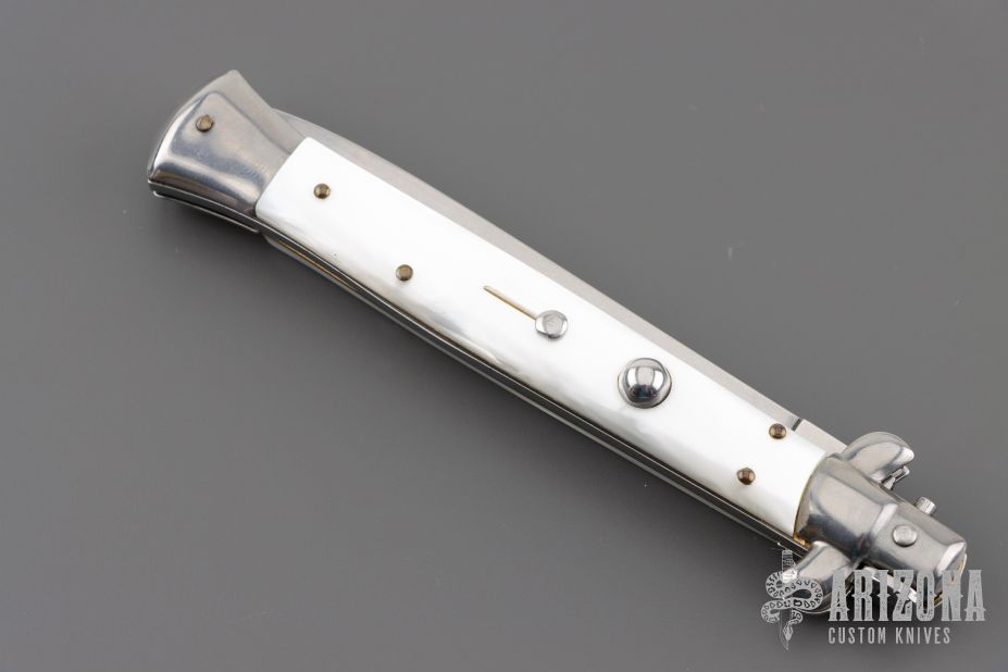 This Swivel Bolster by Frank Beltrame features a polished bayonet ground 4mm blade with false top edge. The handle has stainless steel bolsters, front and rear, pearlex scales, brass liners, stainless spring. Excellent condition.