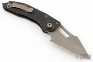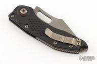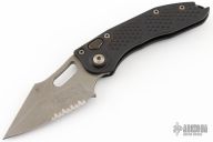 This Stitch Auto by Microtech Knives features a bronzed and tumble finished partially serrated blade and false top edge, notched thumb and finger rests. The handle has a black anodized and milled aluminum handle with a bronzed titanium backspacer and stainless steel clip, tip up carry, lanyard hole at the butt. Comes with original box and papers. Dated 08/2017 and S/N 2281. Has some light scuffs and scratches, great condition otherwise.