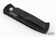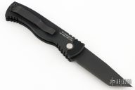 This TR-1.61 Bruce Shaw Skull #1 Auto (95 of 500) has a black DLC chisel grind 154-CM stainless steel tanto blade with satin flats. Handle is matte black contoured aluminum with solid Sterling Silver skull inset and matte black stainless steel tip up clip. Excellent condition. Comes with original box, sheath and papers.