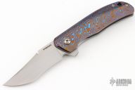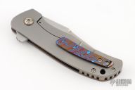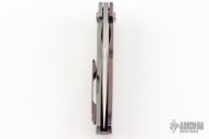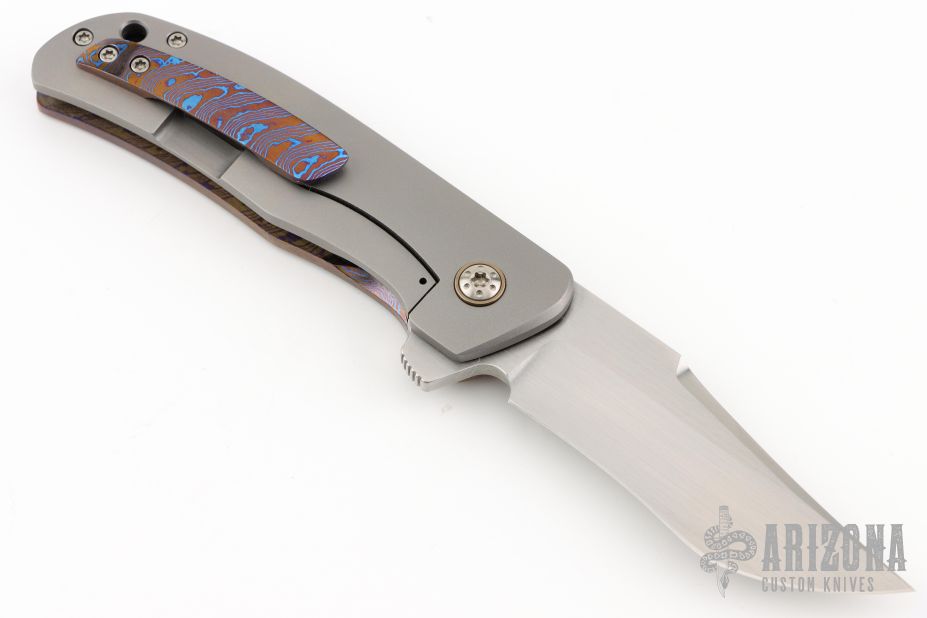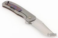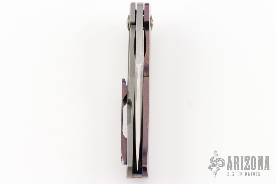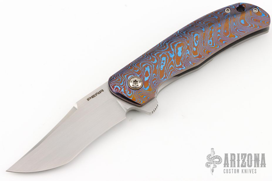 This Dingo Flipper Linerlock by Enrique Pena features a hand rub satin finished blade with flipper. The handle has a MokuTi and bead blasted titanium frame with a MokuTi tip up pocket clip and an anodized titanium backspacer and pivot collars.  Includes a zippered case. Nice detent, lock up and blade seating. Excellent condition.