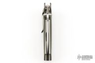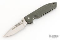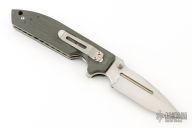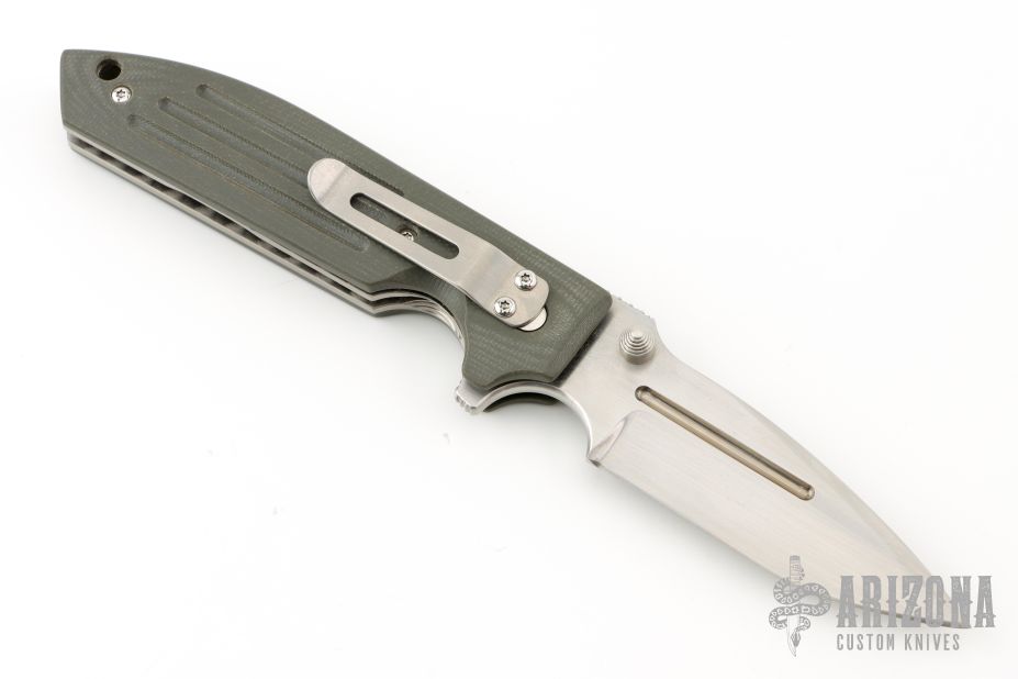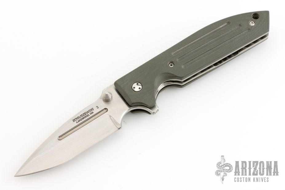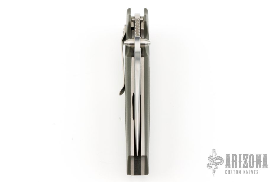 This Dauntless by Phil Boguszewski for TAD Gear features a hand rub satin finished blade with swedge, fullers, dual thumb studs, flipper and checkered thumbrest. The handle has grey G-10 scales over jeweled titanium liners, black linen micarta backspacer, titanium tip down clip and lanyard hole in pommel. Marked "3" on "A" side of blade. Has some light scratches, otherwise excellent condition. Comes with a zippered case.