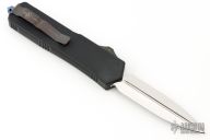 This custom QD Scarab OTF auto has a mirror polished double edged blade with fullers. The handle is black aluminum with carbon fiber on the presentation side. Anodized titanium hardware and a tip down black stainless steel clip and a single anodized titanium glass breaker. Carbon fiber release button has a green tritium insert. Dated 4/2007, S/N 012 and "A. Marfione" on the clip. Comes with azippered case.