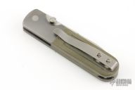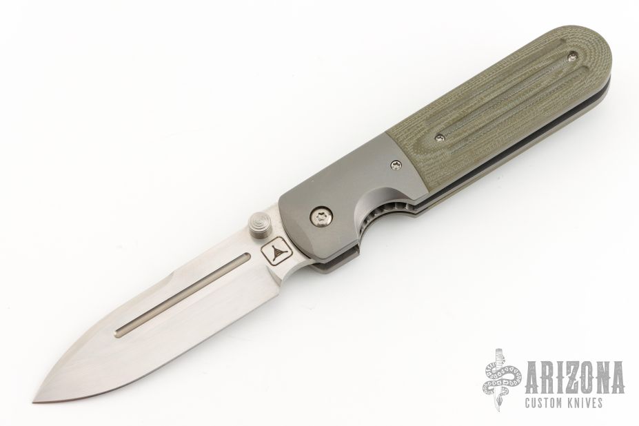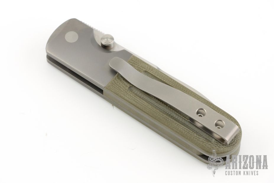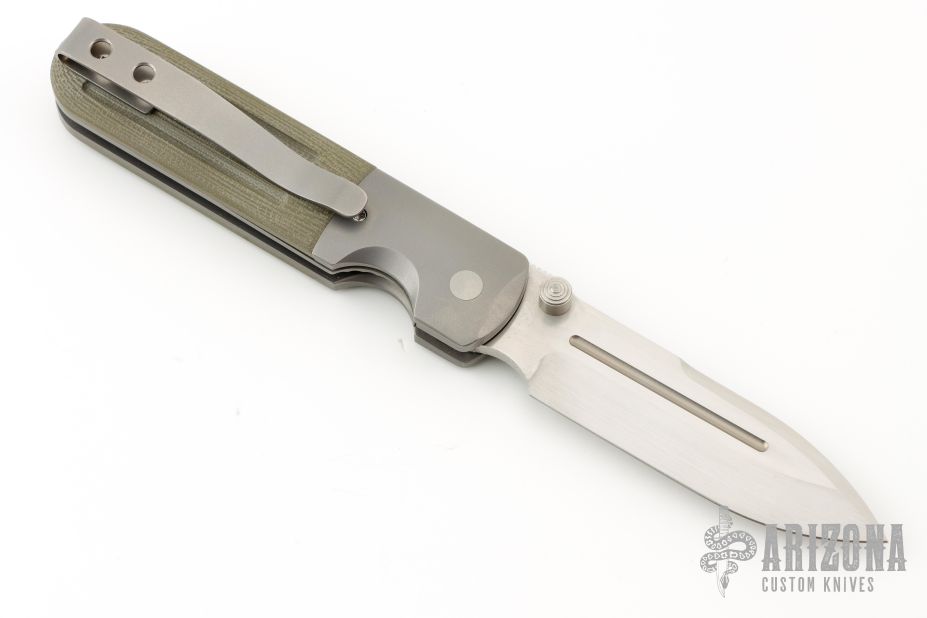 This Capricorn 66 by John W. Smith features a hand rub satin finished blade with dual thumb studs and notched thumbrest and fullers. The handle has bead blasted and dovetailed titanium bolsters, green G-10 scales and backspacer, bead blasted titanium liners, bead blasted titanium tip up clip. Nice lock up, detent and blade seating. Has some light scuffs, otherwise excellent condition. Comes with a zippered case.