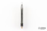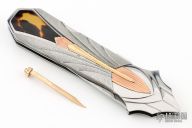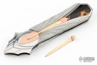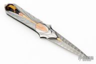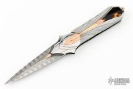 This Interframe Lockback Auto by Ron Best features a Damasteel dagger blade with false top edge. The handle has a stainless steel frame with beautiful gold, rose gold, and Damasteel overlays. The handle also has a stainless steel spacer and release button. Has gold toothpick in pommel with ruby inlay. Nice lockup, action and blade seating. Has a few light scratches, otherwise excellent condition.