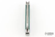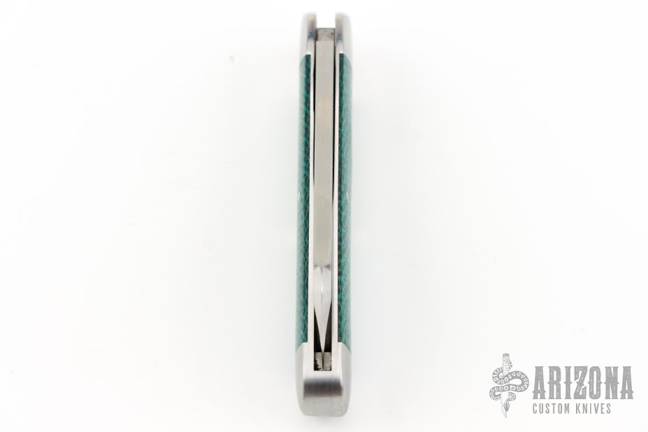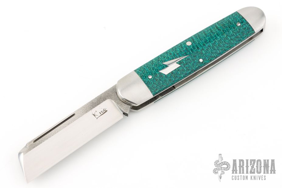 This slipjoint by K'roo Knives features a hand rub satin finished blade with nail nick and stippled flats. The handle has satin finished 304 stainless steel bolsters and liners, teal burlap micarta covers with a stainless steel lightning bolt escutcheon, stainless steel spring. Has half-stop, flush in all positions. Excellent condition. Comes with a leather slip sheath and COA dated August 2022.