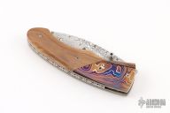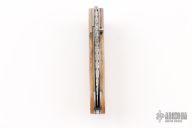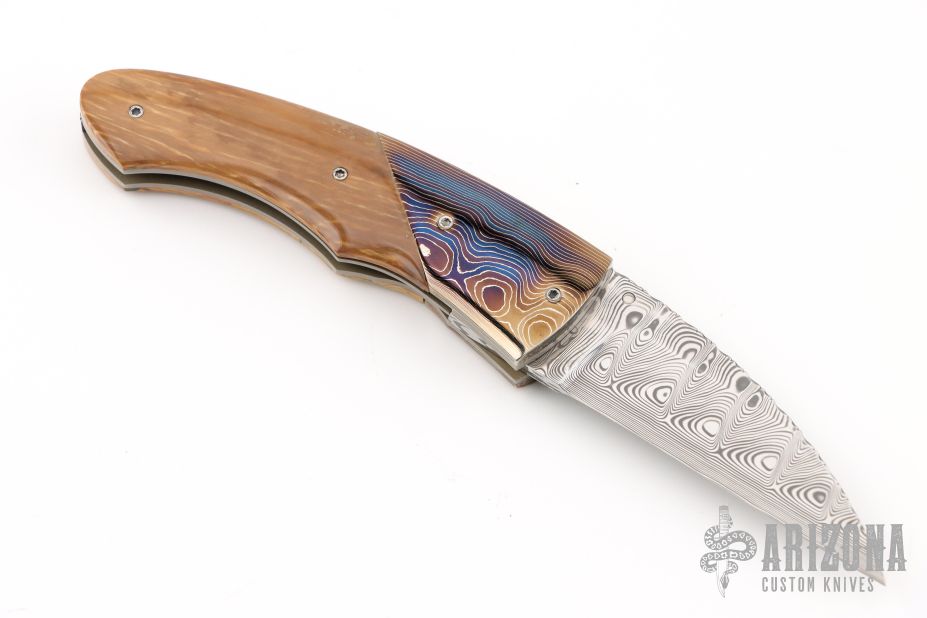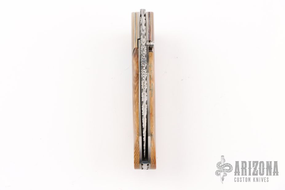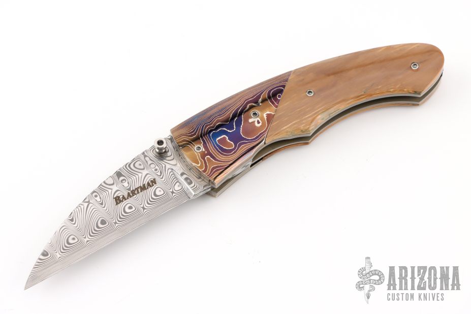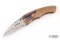 This knife by George Baartman features an Odin's Eye Damasteel blade with a single thumbstud with black inlay. The handle has dovetailed and blued Robert Eggerling Mosaic Damascus bolsters, mammoth ivory scales, satin finished titanium liners, fileworked stainless steel backspacer. Nice detent, lockup, and blade seating. Comes with a COA. Excellent condition.