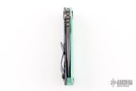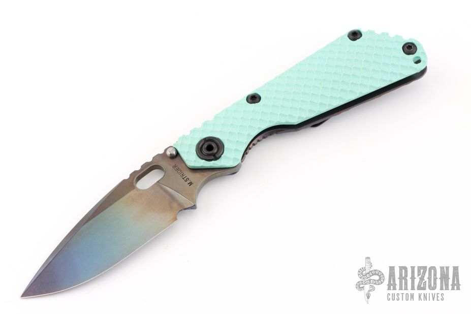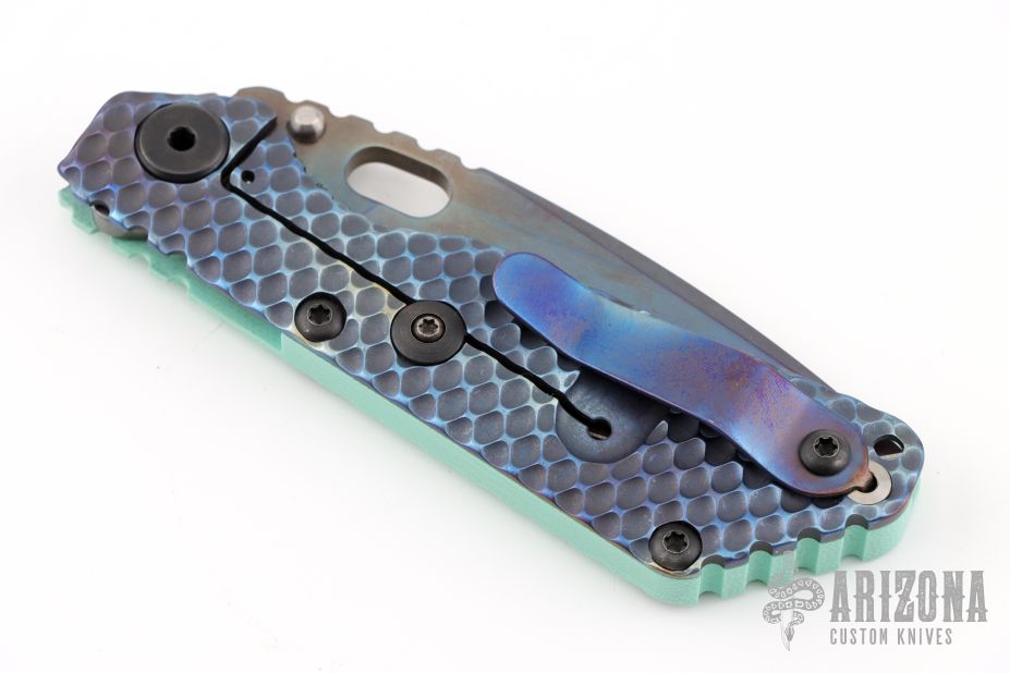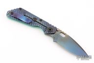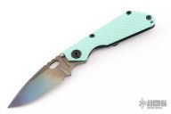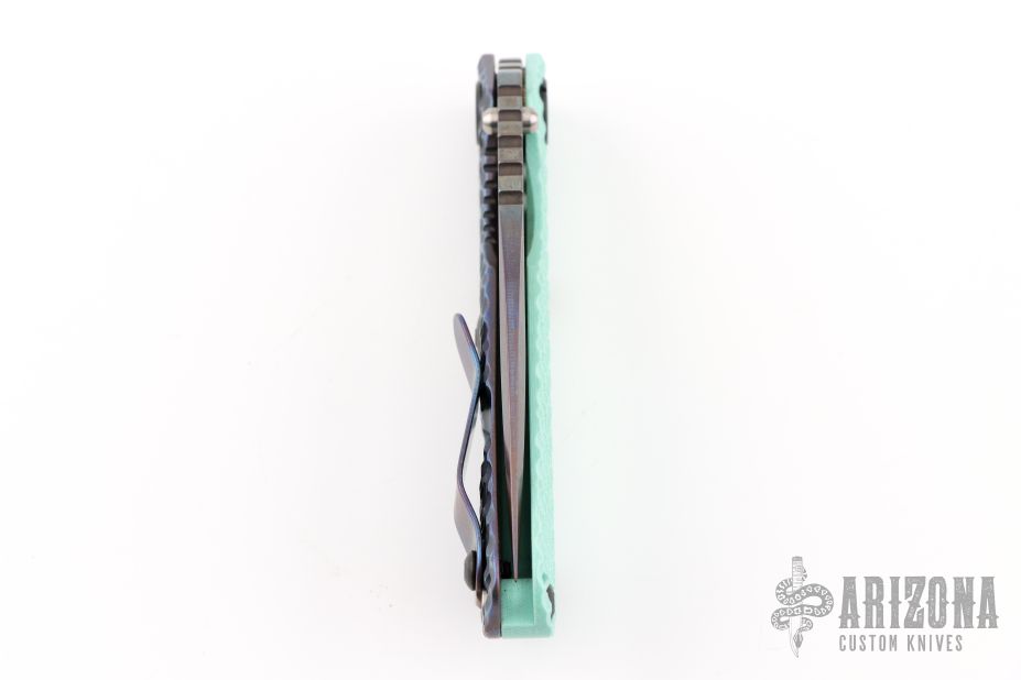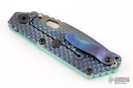 This SNG DGG by Strider has a Heat Color finished spear point blade with dual thumb studs, thumb hole, and notched thumb rest. Handle is TactiBlue G-10 and Heat Color finished titanium "Gunner Grip", lockbar stabilizer, and anodized titanium tip up clip. Nice detent, lockup and blade seating. New condition.
