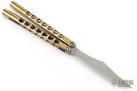 This Balisong by Vincenzo Fiore features a bead blasted blade with false top edge. The handles are anodized integral titanium channel construction that have been skeletonized. Latchless. Has a couple light scratches on the blade, otherwise excellent condition. Comes with a zippered case and COA dated 2020
