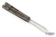 This Alpha Beast Balisong by Blade Runner Systems was reground by Jonny Rotten, it features a satin finished recurve blade. The handle has tumble finished titanium handles with titanium spacers. Comes with a zippered case. Has a few light scuffs, otherwise excellent condition.