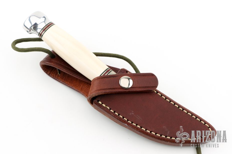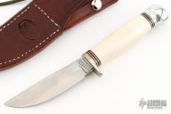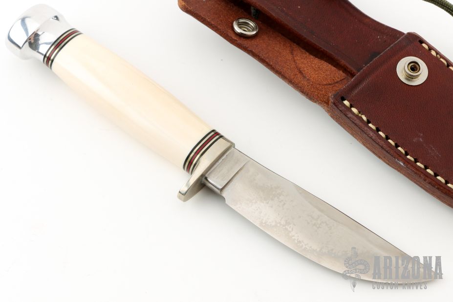 This Woodcraft by Marbles features a satin finished clip point blade with false top edge, .212" blade stock, .945" blade depth, hidden tang construction. The handle has a nickel silver guard, mammoth ivory grip, aluminum pommel, black/nickel silver/red spacers. Includes a Sullivans brown leather sheath. Excellent condition.