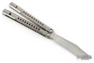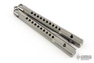 This Monarch balisong by JK Design features a milled, bead blast finish, tanto recurve clip point bade with unsharpened edges. The handles are comprised of bead blast finished titanium with bronze phosphorus washers and steel bushings. Comes with a cloth case. Excellent Condition. This is one of 12 and apparently this is the only one that remained unsharpened.