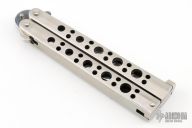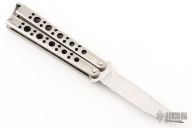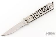 This is a Benchmade Model 10S Bali-Song with a partially serrated blade. The handles are stainless steel with a T-latch. Excellent condition. Comes with original sheath.