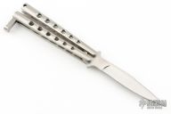This Balisong from Roton Knives features a satin polished blade with false top edge. The handle has a skeletonized integral stainless steel handles with reversible T-latch on pommel. Includes a black leather sheath and original box.  Has a few light scratches, otherwise excellent condition.