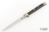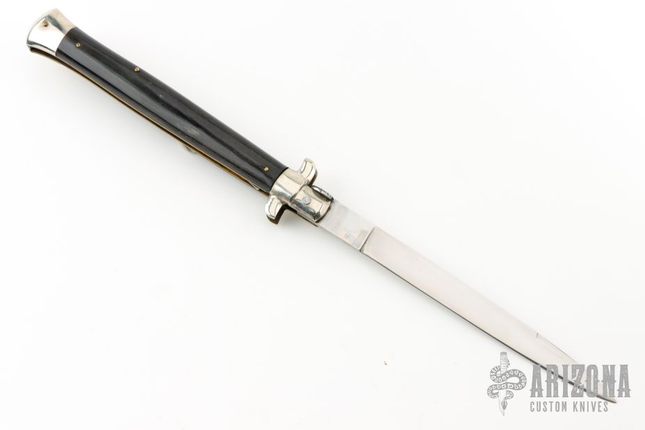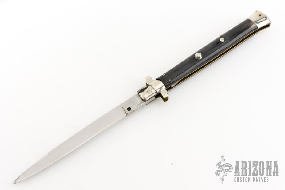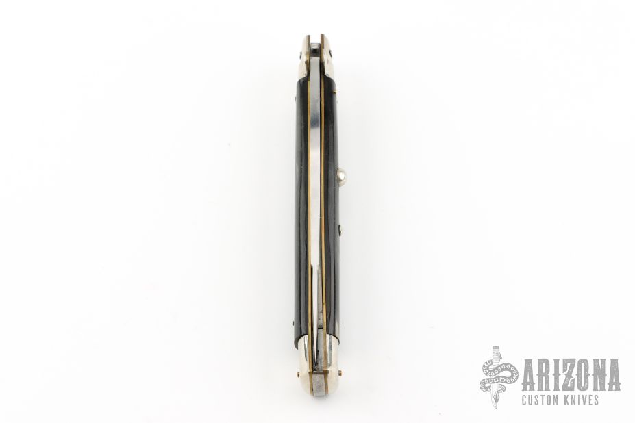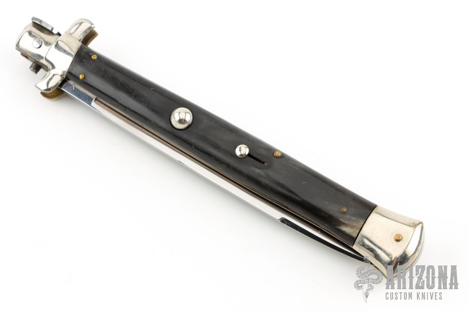 This 13" Swivel Bolster features a bayonet ground blade with false top edge. The handle has nickel silver bolsters, front and rear, buffalo horn scales, brass liners, stainless spring. Has some light scratches and a little blade play, otherwise excellent condition.