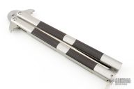 This Mamba by 29 Knives features a satin finished recurve blade with a sharpened top edge. The handles are 303 stainless steel with dovetailed carbon fiber inserts, t-latch at the butt, channel construction. Comes with original box, COA and zippered case. Has a couple light scratches, otherwise excellent condition.