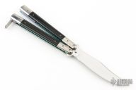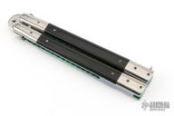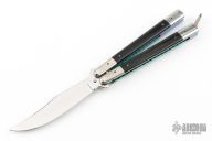 This Balisong by Pinoy Knives (Matt Cook) features a mirror finished blade with false top edge. The handles have satin polished titanium bolsters, black canvas micarta inlays, anodized and jeweled titanium liners, anodized titanium backspacer, titanium t-latch. Has a few light scratches, otherwise excellent condition. Comes with original wooden box.