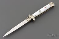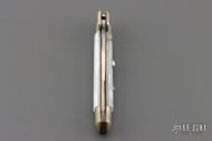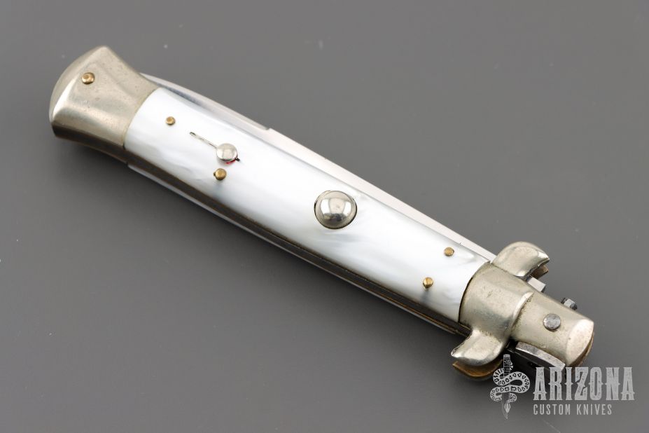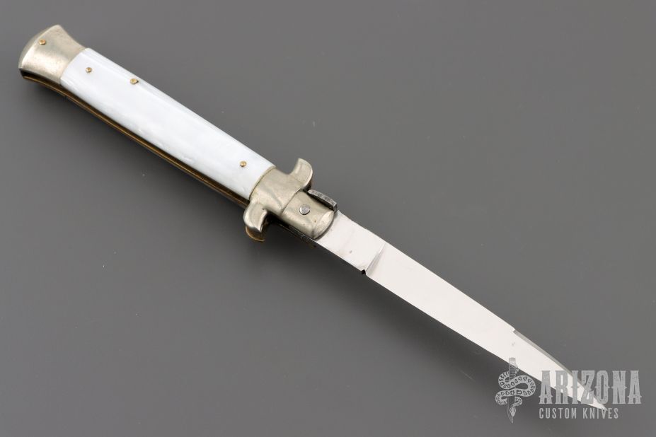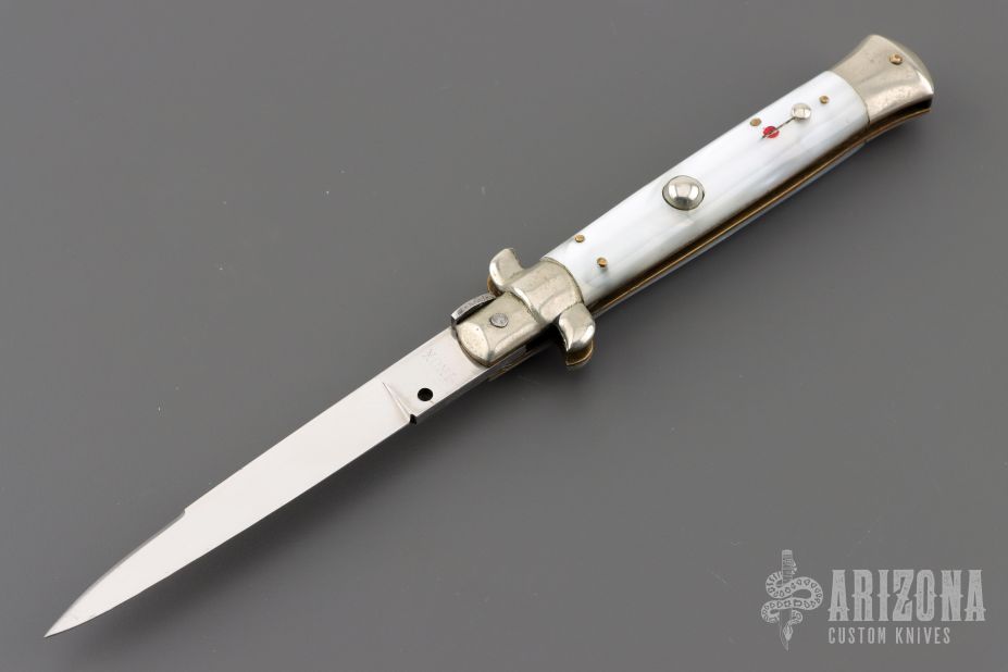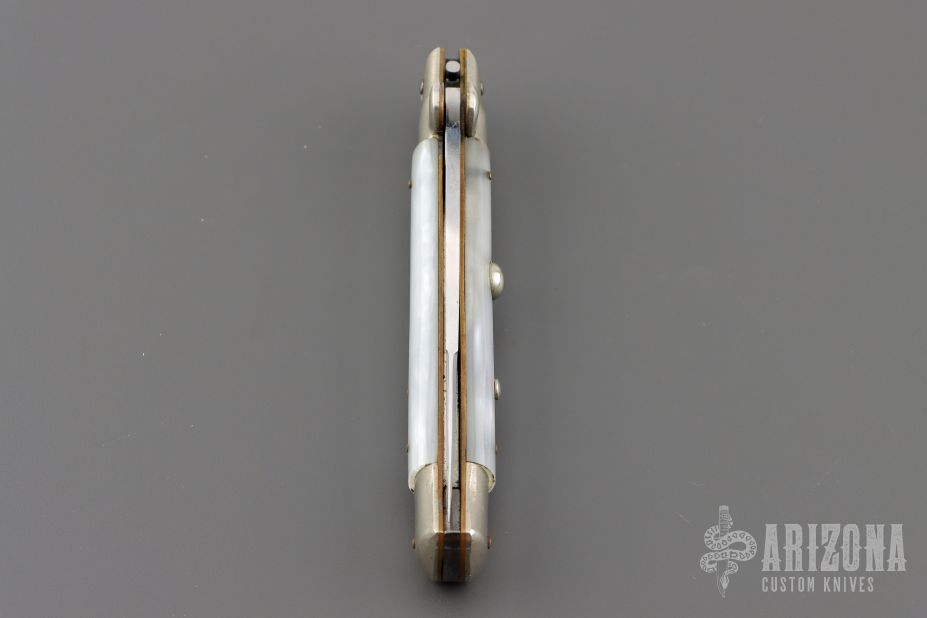 This 9" Picklock features a mirror polished blade drop point blade. The handle has sterling silver bolsters, front and rear, pearlex scales, brass liners, stainless spring. Has some scratches, and patina, great condition otherwise.