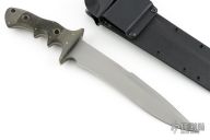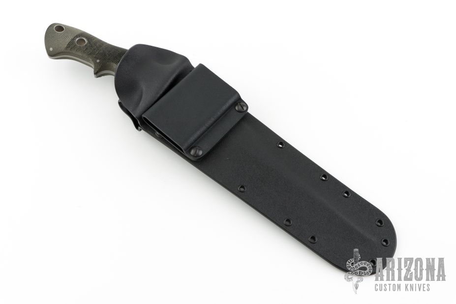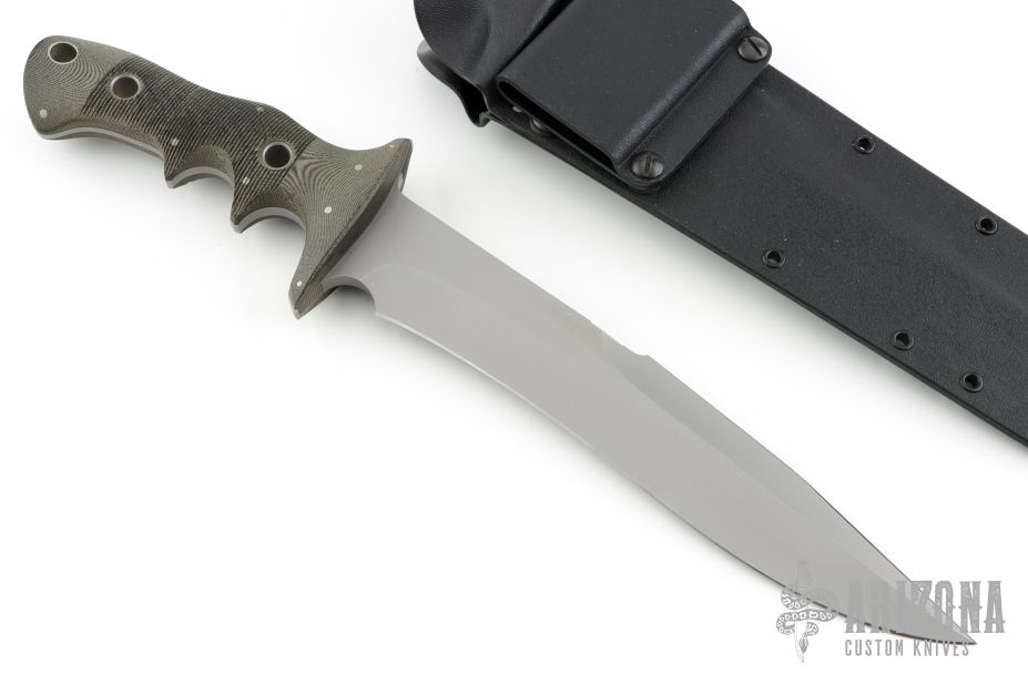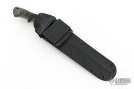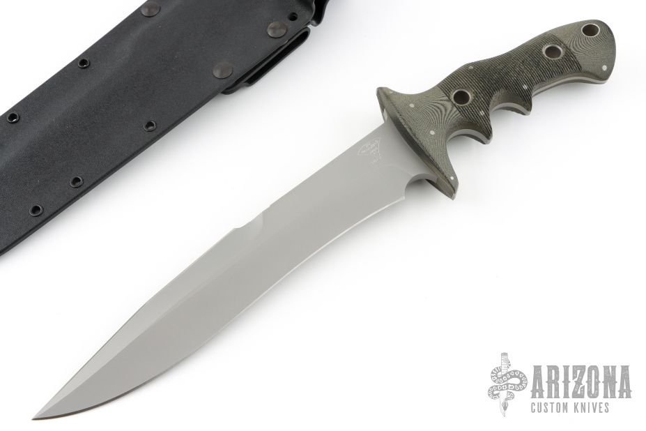 This Flesheater by Jim Hammond features green linen micarta scales. Full tapered tang construction. Blade is bead blast finish with 1/2 of top section sharpened, fuller on the blade spine, .267" blade thickness and 1.536" blade depth. Feels great in hand, light and moves through the air like a breeze. Comes with a kydex sheath with belt loop. The Handle was inspired by Filipino Escrima Master Arsenio Advincula allowing four different grip positions facilitating maximum fighting efficiency for three primary combative distances plus a forward working grip. In the forward grip the index finger is wrapped around the lower guard for maximum control work. First position "modified hammer" grip is forward, finger against the guard. Second position the grip is re-positioned toward the rear for maximum reach. Third the hand is shifted another finger groove back for chopping. This knife is in excellent condition. Truly a classic. Comes with a zippered case.
