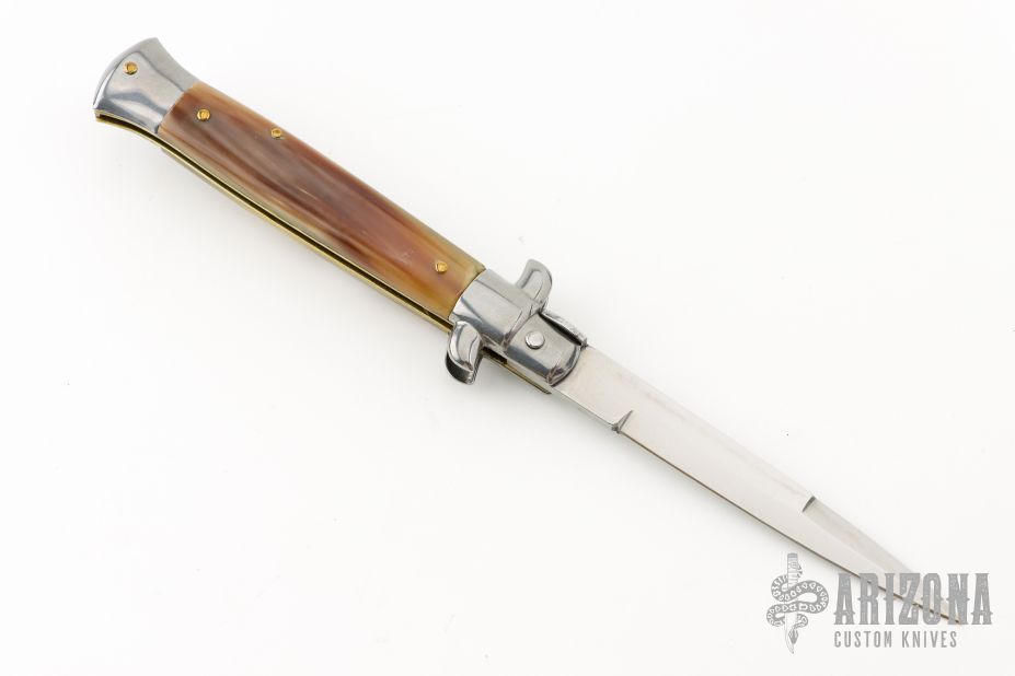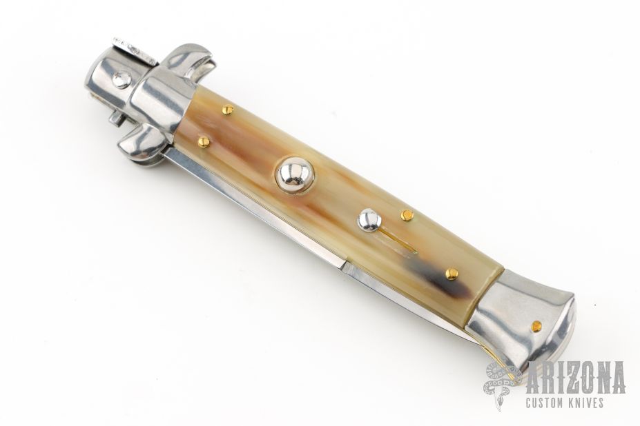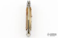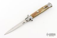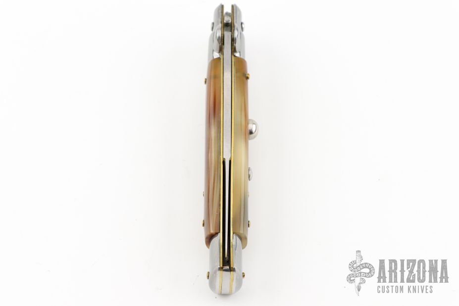 This Swivel Bolster from Stiletto Italy features a bayonet ground blade with false top edge. The handle is comprised of stainless steel bolsters and pommel with honey horn scales over brass liners and stainless steel backspacer. Has some light scratches, otherwise excellent condition.