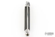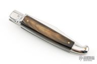 This lever lock auto by AB Italy features a spear point mirror polish finished blade with false top edge. The handle has stainless steel bolsters, front and rear, buffalo horn scales, brass liners, stainless steel backspacer. Has some light scratches, excellent condition otherwise.