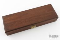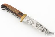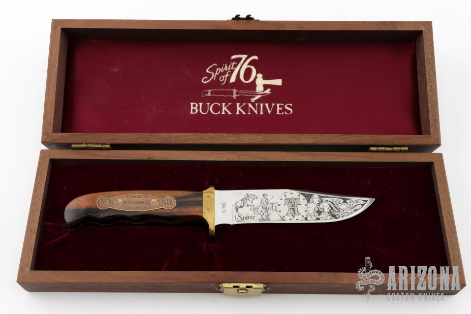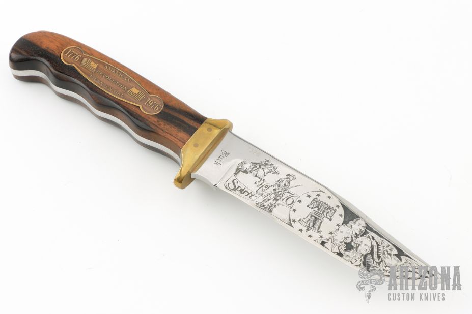 This "Spirit of 76" commemorative knife by Buck features a polished clip point blade with swedge. The handle is comprised of a brass guard and pins with wood scales over full tang construction. The blade has been etched with a scene depicting the Founding Fathers, Paul Revere, The Liberty bell and an Bald Eagle. Medallion inlay on the "B" side of the handle. Number 7326 of 7600. Includes wooden display box and coin. Comes with COA. Excellent condition.