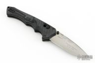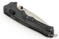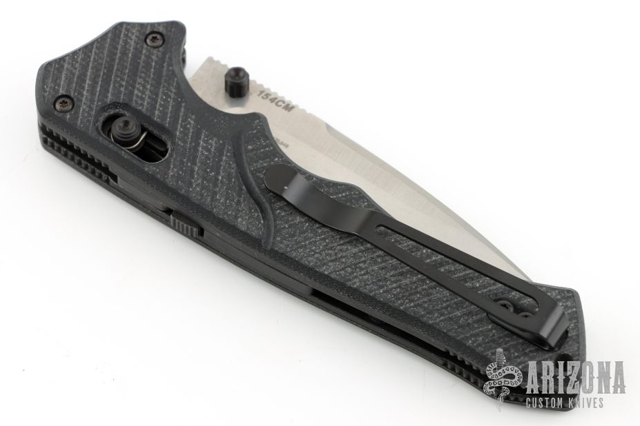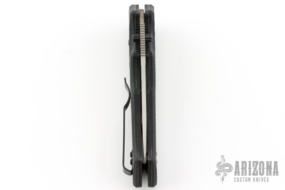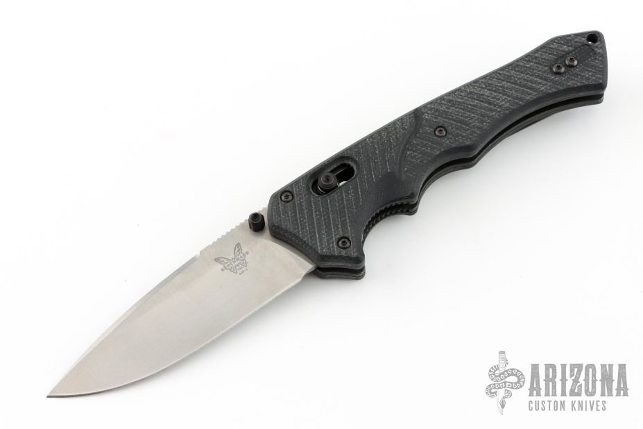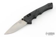 This Mini-Rukus by Benchmade features an assisted opening bead blasted drop point blade with false top edge, dual thumbstuds and notched thumbrest. The handle has black G10 scales over a black steel liners with a black stainless steel tip up clip. Has a safety. "Limited Edition 008 of 100". Comes with original box and papers. Excellent condition.