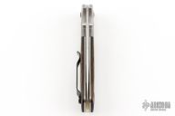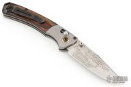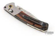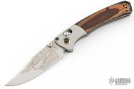 This fantastic piece features contoured wood handles, a black oxide pocket clip, anodized aluminum bolsters depicting a lush landscape, and a satin blade with one of the most detailed laser engraving we've ever seen.