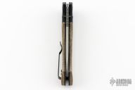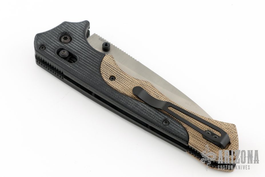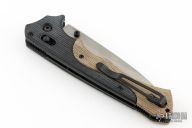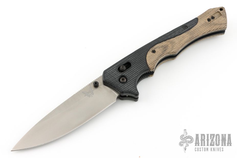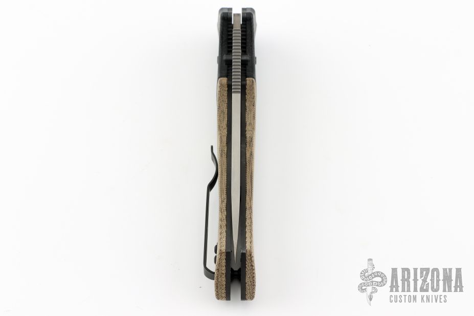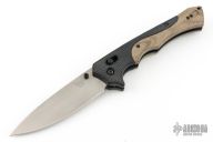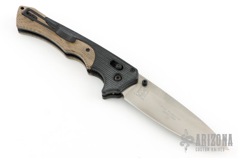 This Rukus by Benchmade is a Niel Blackwood design. Axis lock mechanism. Matte finished plain edge blade with notched thumbrest and dual thumbstuds. The handle has black G-10 bolsters and brown canvas micarta scales, black stainless steel liners and tip up reversible clip. Comes with original box and papers. Excellent condition. 1st Production #0292/1000