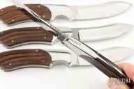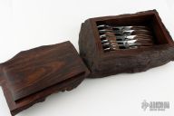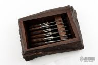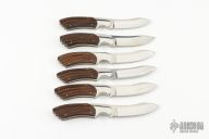 This Set of 6 Steak Knives by Loyd McConnell features mirror polished blades with hand rub satin finished flats, .137" blade stock and .950" blade depth, full tapered tang construction. The handle has mirror polished stainless steel bolsters and carved desert ironwood scales. Each knife is in excellent condition with just a couple very light scratches. The knives come set in a beatiful desert ironwood box with live edges. Stunning really. Truely a one of a kind set from one of Texas's most beloved makers.